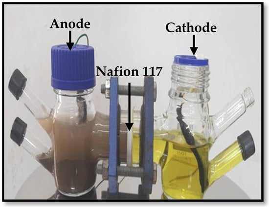The study used a 100 mL MFC setup. The double-chambered MFC was made of borosilicate glass. The volume of both the anode and cathode chambers was 100 mL, with a working volume of 80 mL. Carbon felt with a geometric area of 2 × 5 cm2 was used as an electrode in both chambers. The anode and cathode chambers were connected externally using copper wire. A proton exchange membrane (Nafion 117; Vinpro Technologies, Hyderabad, India) was used to separate the anode and cathode chambers. The anode substrate was distillery spent wash, and the cathode solution was analytical-grade potassium ferricyanide 0.2 g/L. Wetland sediment was used to inoculate the anode chamber, and the setup used in this study is shown in Figure 2.