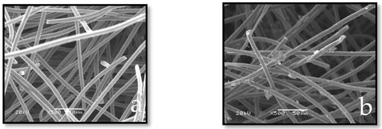 The morphological characteristics of the prepared electrodes were investigated using scanning electron microscopy at multiple magnification levels. It was observed that macro pores, cracks, collapsed filaments, or any other macroscopic surface impairment were absent, and large numbers of smooth and clean carbon fibers were observed on untreated carbon felts (Figure 3a). In addition, the SEM image of oxidized carbon felt resulted in a rough surface compared to the simple smooth surface of the untreated electrode. A clear, visible, scattered, and rough oxidized carbon surface enhances the overall surface area for microbial adhesion (Figure 3b).