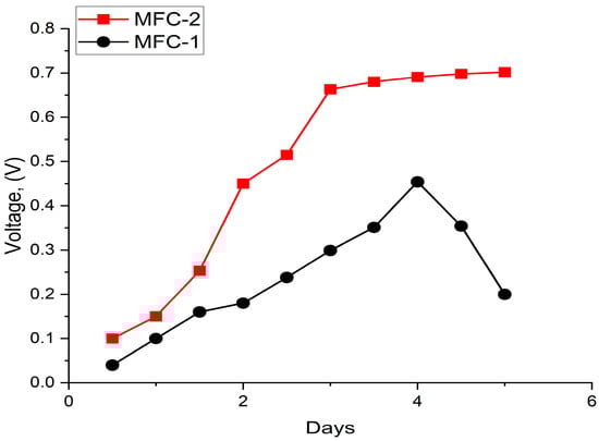 The initial operation of the microbial fuel cell was conducted under open-circuit voltage conditions. This configuration represents the theoretical maximum voltage attainable by the system in ideal circumstances and remains unaffected by the flow of electric current through the circuit. There is no load connected to it, meaning there is infinite resistance. During the initial operational phase, synthetic wastewater was used as the anolyte medium for both MFC-1 and MFC-2. Initially, stable voltage was obtained in 7 days (0.620–0.650 V) of retention time, meaning that the carbon felt in both MFCs became thoroughly infused with bacterial culture. After this, the synthetic wastewater was replaced with 5000 mg/L of COD strength spentwash [23]. The experimental results revealed that the maximum open-circuit voltage (OCV) attained by the two microbial fuel cell systems differed significantly. MFC-1 reached its peak OCV of 0.454 V on day 5, while MFC-2 demonstrated superior performance with a maximum OCV of 0.702 V during the same period (Figure 4).