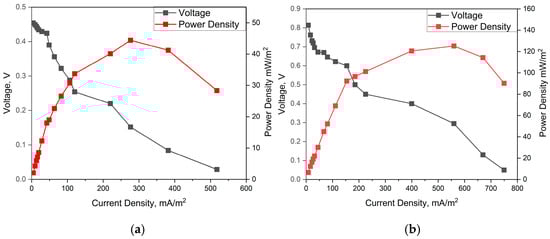 Subsequently, a reduction in voltage was observed, indicating the necessity for introducing fresh inoculum to sustain metabolic functions [24]. The characterization of current as a function of cell voltage was accomplished through the utilization of a polarization curve. During close circuit conditions, the voltage remained relatively constant at 1.815 ± 0.035 V when the resistance was decreased from 500 Ω to 153 Ω. A sharp decline in voltage was observed upon further reduction in the external load from 153 to 50 Ω. This finding suggests that maintaining an external load of 153 Ω enables the generation of substantial current with minimal voltage drop. As a result, an external resistance of 153 Ω was selected for subsequent experimental investigations. The experimental results revealed peak current densities of 517.85 mA/m2 and 749.56 mA/m2 for MFC-1 and MFC-2, respectively (Figure 5a), with corresponding peak power densities of 44.42 mW/m2 and 125.23 mW/m2 (Figure 5b). Subsequently, both microbial fuel cells experienced a reduction in these parameters. This decrease may be attributed to membrane fouling, which potentially influences several factors, such as ion exchange capacity and proton transfer conductivity [25]. The elevated power density observed in MFC-2 may be attributed to enhanced microbial attachment, which facilitates improved electron transfer mechanisms and consequently diminishes the system’s internal resistance [26,27].