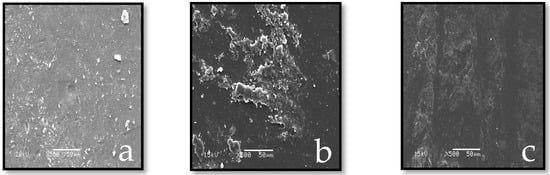 The results indicate that the membrane exhibited a mosaic-like structural configuration. During long-term MFC operation, the proton exchange membrane is easily contaminated by microbes, extracellular polymers, and inorganic salts, impairing MFC effectiveness [40]. Several studies have demonstrated that fouling can potentially modify the ion exchange capacity and permeability of membranes through physical obstruction [41]. Evidence suggests that the fouling process of the cation exchange membrane (CEM) is exacerbated by biopolymers derived from biocatalysts and cations present in the electrolyte solution. This enhancement in biofouling is believed to result from the formation of intermolecular bridges connecting organic foulants with cations, thereby intensifying the accumulation of undesirable substances on the CEM surface [42,43]. The experimental results revealed that MFC-1 and MFC-2 achieved maximum power densities of 44.42 mW/m2 and 125.23 mW/m2, respectively. Subsequently, both fuel cells experienced a decline in these values. Membrane fouling, which may lead to decreased efficiency, can be attributed to several factors. These include the encapsulation of bacterial cells within extracellular polymeric matrices, the accumulation of sludge components, and the formation of inorganic salt precipitates on the membrane surface. Scanning electron microscopy (SEM)analysis of the membrane was conducted before and after operation (Figure 9a–c), providing visual evidence of membrane fouling, which negatively influences the efficacy of (MFCs) efficacy. This observation is consistent with results obtained from other electrochemical techniques, including open-circuit voltage (OCV) measurements, polarization curve analysis, cyclic voltammetry (CV), and electrochemical impedance spectroscopy (EIS).