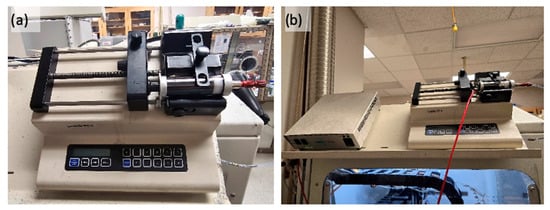 For the ultrasonic coating, a SONO-TEK ExactaCoat machine (Milton, NY, USA) with the ultrasonic head configuration was used to spray coat swatches of carbon fiber tows inside an encased fume hood. This machine is manufactured by SONO-TEK at their industrial headquarters in Milton, New York, USA. The attached nozzle (AccuMist™ nozzle) transfers high-frequency sound waves into mechanical energy to create standing waves in the mixture passing through the nozzle end, which atomizes the active material as it exits the nozzle. The operating frequency of the nozzle dictates the nominal droplet size by fluctuating the vibrations felt in the mixture. The vibrations created a soft spray with a homogeneous droplet size at a constant frequency, resulting in a uniform surface coating. Two different syringe pumps were used: the standard syringe pump and the SonicSyringe pump shown in Figure 1a and Figure 1b, respectively. The SonicSyringe works similarly to the head nozzle, using sound waves to maintain a uniform mixture within the syringe during the coating process.