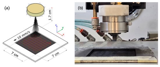 Bare Toray T800S 12k carbon fiber tows were laid taught across a stainless-steel 7 cm by 7 cm frame and secured with painter’s tape (Figure 2). This swatch of carbon fiber was centered in the ultrasonic machine on a curing plate. The XYZ tracing system, installed with the machine, was used to input the dimensions of the swatch into the software by mapping three corners of the area to be coated. A working distance of 45 mm in the Z direction was input manually. The software used for the Exactacoat machine is Windows-based and is called Pathmaster, the version used was 1.0.3. In the Pathmaster software, this 45 mm value is based on the internal tracing dimensions of the nozzle, meaning 0 mm correlates to the highest position the tracing system can achieve. Due to this, the actual distance from the nozzle to the CF swatch was 1.75 cm. The ultrasonic nozzle traced the area in the Y direction at 10 mm/s, coating columns 2 mm apart in the X direction and spraying at a rate of 6.5 mL/h.