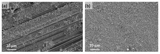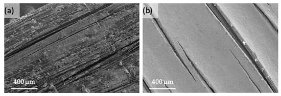 As seen in the labelled SEM images, the width of the dip-coated carbon fiber tow seen in Figure 6a (313.2 μm) is roughly double the width of the ultrasonically coated carbon fiber tow (145.3 μm). This thickness increase could stem from many factors, such as the increased permeation of the slurry into the carbon fiber with dip coating. Another contributing factor could be the excess of slurry applied to the carbon fiber tow, which is inevitable with the dip-coating technique or other methods, for that matter. The additional weight of the slurry on the tow, specifically on the edges, could cause folding regardless of the tension applied by the dip-coating rods. Furthermore, the ultrasonically coated carbon fiber tow in Figure 6b is very compact and uniform in its fiber density. Again, this could be attributed to multiple reasons, but the two leading hypotheses are that the stainless-steel framework used during coating provides even tension across the tows, preventing warping, and that the simultaneous coating and curing prevents overloading of the tows. Maintaining the structural integrity of the base tows is crucial in ensuring the mechanical strength of the carbon fibers remains even after coating.