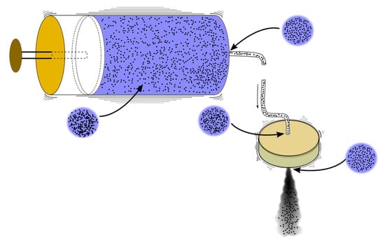 Sketch showing the deagglomeration of particles during ultrasonic vibration inside the head of the nozzle.