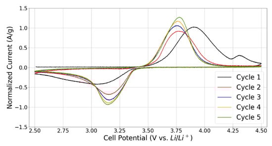 The cell was swept over five cycles between 2.5 V and 4.5 V, sweeping at a rate of 0.001 V s−1. The upper and lower voltage limits were chosen to analyze the possibility of unexpected electrochemical reactions unique to an LFP carbon fiber matrix. An initial solid electrolyte formation (SEI) was seen at 4.25 V during the first cycle, as shown in Figure 8. Following this, the cell stabilized and showed promising reversibility, with the oxidation and reduction peaks being close in magnitude. The increase in current at the peaks for cycles 2–5 showed a predictable increase in resistance as the cell was cycled. Despite stressing the cell with an upper limit of 4.5 V, its stability proves that ultrasonic coating offers competitive lithium-ion diffusion.