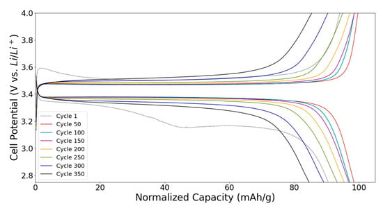 To test the capacity of the ultrasonic coating, a half-cell was cycled between 2.75 V and 4.0 V, versus Li/Li+, at an initial rate of 0.1 C for the first two cycles to promote the formation of the SEI. After this, the current was increased to 0.5 C, and the cell was cycled until the capacity retention dropped below 80%. Figure 9 shows the lithiation and delithiation of the cell across 350 cycles at 50 cycle intervals. Cycle 1 shows the SEI formation, falling below the capacity of the following 250. The cell showed a recovery and increased capacity after the formation cycles, in contrast to the expected behavior of irreversible capacity loss following SEI formation as outlined in ref. [19]. A small amount of lithium ions was consumed during the SEI formation [20]. However, the significate recovery may be attributed to the excess lithium ions available in the cell due to the LFP-coated electrode providing ions to the lithium disk. The atomized surface coating of the carbon fiber may have allowed for a more complete delithiation cycle, allowing some ions from the LFP to replenish the lithium metal. This process would also contribute to the stability shown by the cell. Following formation, a slow, consistent capacity drop occurred as expected with a tight window in potential between 3.2 V and 3.6 V up to 70 mAh/g for each cycle. This window of constant voltage is caused by the two-phase transition of LFP as lithium ions move across the cell during lithiation and delithiation [21]. Its persistence around 3.4 V again proves the strong stability of the cell.