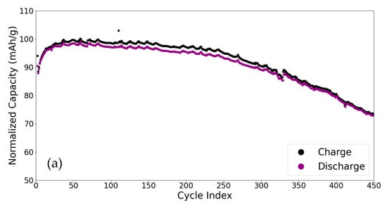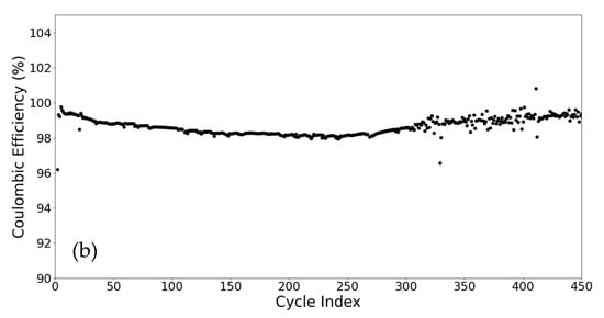 The capacity drop of the half-cell per cycle is shown in Figure 10a for both the charge and discharge steps in each cycle, going up to 450 cycles following the schedule described above. Using the ratio of discharge to charge capacity for every cycle, the coulombic efficiency was found to remain at nearly 100% for the entirety of the 450 cycles, as seen in Figure 10b. A large drop in capacity can be seen in the initial formation cycles, followed by a quick recovery and stabilization. The half-cell reached a capacity of 99 mAh/g after 100 cycles and 97 mAh/g after 200 cycles before dropping to 73 mAh/g after 450 cycles.