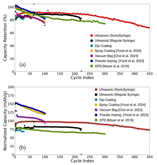 Comparison of (a) capacity retention and (b) capacity for the ultrasonic method against other coating methods found in the literature, including spray coating [18], hot press vacuum bag coating [11], powder impregnation [17], and EPD [22].