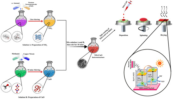 Titanium tetraisopropoxide (TTIP) was used as the metal oxide precursor, and n-butanol served as the solvent in a 2:8 ratio to synthesize TiO2 via the sol–gel method [46,47]. The TiO2 sol was prepared by stirring the mixture for 2 h. The TiO2/CuO heterostructure was synthesized using a simple chemical reduction method [48,49]. Specifically, different amounts of copper nitrate (Cu(NO3)2), such as 0.001 g, 0.005 g, 0.01 g, and 0.05 g, were dissolved in methanol to form a CuO solution. Then, the CuO solution was slowly added to the as-prepared TiO2 sol. The mixture was stirred for 30 min to allow uniform dispersion and interaction. Subsequently, the resulting solution was ultrasonicated for 1 h to ensure homogeneous mixing and to facilitate heterostructure formation.