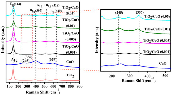 The Raman spectra revealed surface modifications induced by vibrational modes, and the analysis was performed to demonstrate the phases and impurities detected in the TiO2/CuO heterostructure. Figure 2 shows strong Raman signals within the 140 to 800 cm−1 range, which is commonly used to identify heterostructures. For anatase TiO2, six distinctive Raman-active modes were observed at 144 cm−1 (Eg), 197 cm−1 (Eg), 397 cm−1 (B1g), 518 cm−1 (A1g + B1g), and 640 cm−1 (Eg), substantiating the presence of the anatase TiO2 phase [48,49]. In the TiO2 Raman spectrum, the active vibrational modes included (i) symmetric vibration of O–Ti–O, corresponding to the doubly degenerate Eg modes at 144 and 640 cm−1, and (ii) symmetric bending vibration of O–Ti–O, associated with the B1g mode at 397 cm−1. Additionally, the Ag peak at 245 cm−1, attributed to CuO, further confirmed the presence of anatase TiO2-specific peaks, as reported in the literature [50,51]. The CuO caused shifts in the Raman peaks associated with the B1g and A1g vibration modes, confirming the structural phases of TiO2 and CuO in the TiO2/CuO heterostructure. The incorporation of CuO altered the structural and vibrational features of the TiO2 lattice, suggesting significant interaction between the two oxides. Such interactions are likely to generate surface defects that may function as photoactive sites, thereby improving charge separation efficiency [52]. As observed, the Raman spectrum of CuO at 245, 356, and 582 cm−1 corresponded to Ag and Bg modes, respectively [53]. However, in the TiO2/CuO heterostructure analysis, CuO-related signals were not prominently detected, likely due to signal suppression by the stronger TiO2 peaks. This was ascribed to the enhanced crystallinity or greater abundance of TiO2 within the heterostructure. The absence of detectable CuO peaks further supported the successful formation of the TiO2/CuO heterostructure. Similar peaks were observed across the heterostructures with different CuO weight percentages, confirming the consistent presence of anatase TiO2 crystallites. At lower CuO contents, CuO-related signals were more challenging to detect due to the dominant Raman response of TiO2, which highlighted the successful integration of CuO into the heterostructure [54].