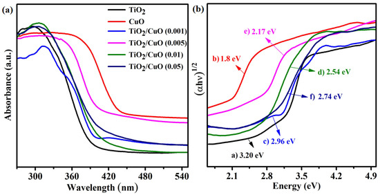 (a) UV–vis diffuse reflectance spectra (UV–vis DRS) of the as-prepared samples: TiO2, CuO, and TiO2/CuO heterostructures with varying CuO content (0.001, 0.005, 0.01, and 0.05 wt%). (b) Tauc plots derived from the transformed Kubelka–Munk function versus photon energy (hν) for determining the optical band gaps of (a) TiO2, (b) CuO, (c) TiO2/CuO (0.001), (d) TiO2/CuO (0.005), (e) TiO2/CuO (0.01), and (f) TiO2/CuO (0.05).