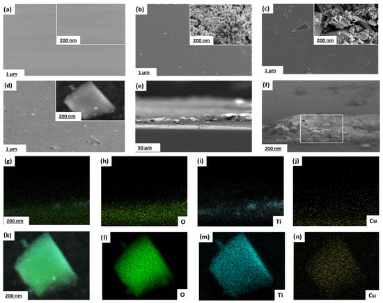 Scanning electron micrographs of (a–d) images (with insets showing higher magnifications) of (a) bare 304SS, (b) TiO2-coated, (c) CuO-coated, and (d) TiO2/CuO (0.005)-coated 304SS substrates. (e) Cross-sectional SEM image of TiO2/CuO (0.005)-coated 304SS indicating coating thickness and morphology. (f) Higher magnification cross-sectional SEM image highlighting the interface between coating and substrate. (g–j) EDS elemental mappings (cross-sectional) for O (h), Ti (i), and Cu (j) confirming the vertical spatial distribution of the elements in the heterostructure. (k–n) EDS elemental mappings (plan-view) showing the homogeneous distribution of O (l), Ti (m), and Cu (n) in the selected area of the TiO2/CuO (0.005) heterostructure.
