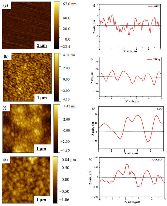 Atomic force microscopy contact-mode 2D topography images of (a) bare 304SS, (b) TiO2, (c) CuO, and (d) TiO2/CuO (0.005). Line profiles of (e) bare 304SS, (f) TiO2, (g) CuO, and (h) TiO2/CuO (0.005) heterostructures coated on 304 stainless steel (304SS).