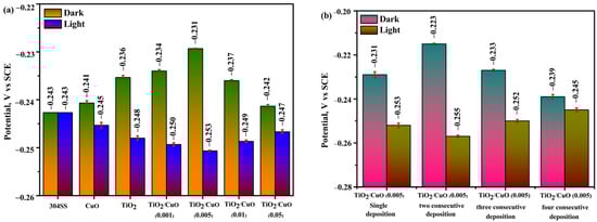 As shown in Figure 8, under light irradiation, the OCP values of the TiO2/CuO-coated 304SS shifted toward more negative potentials, suggesting the generation of photocurrent as a result of photoexcited electrons transitioning from the valence band to the conduction band [70,71]. For instance, the corrosion potential of TiO2/CuO (0.005) changed from −0.234 V (vs. SCE) to −0.255 V (vs. SCE) under light illumination, highlighting the improved photocathodic corrosion protection provided by the TiO2/CuO (0.005) coating. The significant variations in the corrosion potential with light ON/OFF conditions observed for the TiO2/CuO (0.005) coating further indicate its effectiveness in providing photocathodic corrosion protection for 304SS. These results demonstrate the potential of TiO2/CuO heterostructures in improving corrosion resistance in environments exposed to light irradiation.