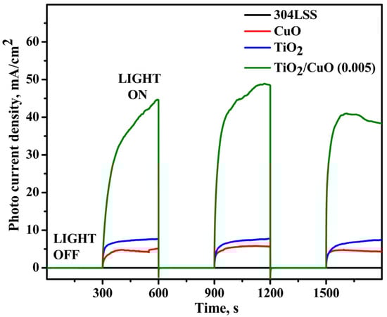 Figure 9 presents the transient photocurrent responses of uncoated 304SS, CuO, TiO2, and TiO2/CuO-coated 304SS under visible light illumination. In the absence of light, all samples exhibited a negligible photocurrent density (~0 mA/cm2). A sharp rise in photocurrent density was observed upon lighting, indicating efficient photoresponse and successful migration of photo-generated electrons to the 304SS substrate. The pure CuO electrode generated a photocurrent density of approximately 4.2 mA/cm2, whereas pure TiO2 exhibited a higher value of around 7.6 mA/cm2 despite its limited absorption in the visible spectrum [72].
