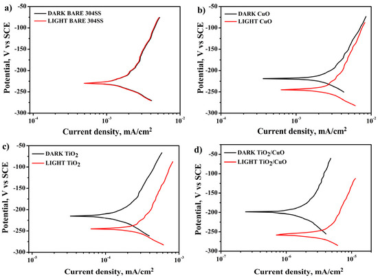Potentiodynamic polarization diagram for (a) 304SS in dark and light, (b) CuO in dark and light, (c) TiO2 in dark and light, and (d) TiO2/CuO in dark and light conditions in 3.5% NaCl.