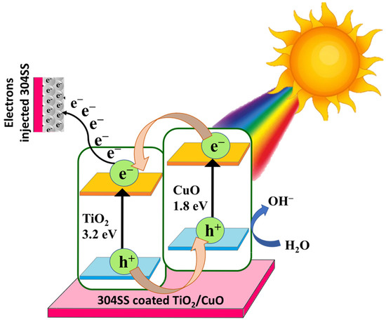 In conclusion, the synergistic integration of TiO2 and CuO in the 0.005 composition leads to a well-aligned Type-II heterojunction [85,86]. The observed shifts in flat band potentials and the narrowed bandgap support this mechanism, establishing the TiO2/CuO (0.005) system as a promising candidate for visible-light-driven corrosion protection of 304 stainless steel. The schematic representation of the proposed photocathodic corrosion protection mechanism based on the Type-II heterojunction formed between TiO2 and CuO coated on 304 stainless steel is shown in Figure 14.