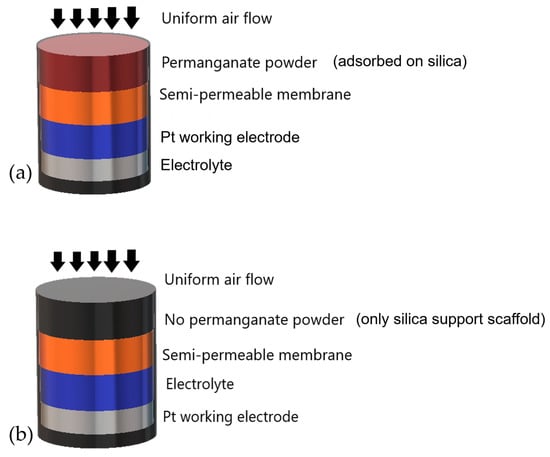 It was theorised that a relatively minor change to the design of the CO-AF sensor would allow for the detection of an important class of VOC, namely primary alcohols. This would enable greater commercial success for the company via a simple and cheap change in the manufacturing process. The layer of KMnO4 acts as an oxidising filter layer at the top of the stack, which is designed to remove certain reducing gases (e.g., H2S) that can poison the electrocatalysts and interfere with the response of the device to the analyte [52,53]. Normally (within the CO-AF sensor), this filter destroys H2S via oxidation using KMnO4/silica powder. However, this is not suitable for an alcohol sensor because the MnO4− oxidant will react with the primary alcohol analyte before the analyte reaches the Pt working electrode. Thus, it was removed during the assembly of a batch of CO-AF sensors, subsequently designated CO-A1 sensors (Figure 1b). It must be noted that the potassium permanganate powder was not truly removed; rather, a silica support structure that was not impregnated with the potassium permanganate powder was used in the construction of the CO-A1 sensor. The use of the term “removed” is simply used to help differentiate between the standard CO-AF sensor and the modified CO-A1 sensor used in this investigation. More information as to the typical operation of the CO-AF sensor can be found online, including its operating specifications and detection limitations [54].