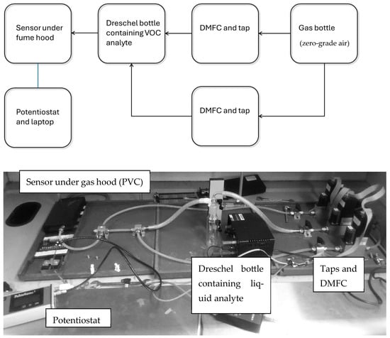 The sensor was housed within a plastic hood and setup as shown below (Figure 3). The plastic hood simply serves to ensure the vapour is delivered directly to the sensor and the vapour concentration does not dissipate as it would in open air. The hood has an internal volume of 15.6 cm3 when empty. Commercially supplied zero-grade air (supplied by BOC Industrial Gases Ltd., Woking, UK) was used as the carrier gas to bubble through the Dreschel bottle containing the liquid analyte. The air containing the analyte vapour was then blown onto the top of the sensor from the top of the plastic hood. Direct mass flow controllers (DMFCs) using the Brooks 0260 Smart Interface software (model 5850S) were used to regulate the gas flows via a laptop (Windows 7). The DMFCs were calibrated to zero before each test. Zero-grade air is synthetic air that has been filtered so that it contains only nitrogen and oxygen and minor trace impurities (BOC product code: 270020-V; CAS number: 132259-10-0). Analyte data was taken from the literature [55], derived from experiemntal data [56,57]. All EIS data were recorded as a three-electrode system using a PalmSens 3 potentiostat and PSTrace 5.7 software, and the raw data were subsequently imported to Microsoft Excel for analysis. All potentials are vs. Pt/Pt+ unless otherwise stated. All scan rates and potential ranges were standardised via the PalmSens3 potentiostat. The potentiostat was calibrated by the manufacturer one month before being used in the experiments. Thus, the potentiostat was considered to still be within its calibration window. The sensor did not undergo any preconditioning prior to testing. The manufacturer (Alphasense) recommends operating voltages between −0.1 and +0.3 V, with a nominal sensor performance at 0.0 V (for the commercial CO-AF sensor). This helps to avoid any changes in the electrode surface that can occur at high cycling voltages [58,59,60,61]. For the EIS measurements, the primary alcohols were introduced to the sensor individually, with 24 h between each alcohol vapour experiment. The EIS measurements were conducted from 10 Hz to 0.1 Hz. Exposure times are for the duration of the experiment (e.g., EIS) unless otherwise shown on the graph (e.g., chronoamperometry). The chronoamperometry experiments were conducted at a 50 mL min−1 flow rate and at 0.0 V dc as per the manufacturer’s recommendation. The tests of chronoamperometric response to different functional groups were also conducted at a 50 mL min−1 flow rate at 0.0 V dc. All other experiments were conducted at a 50 mL min−1 flow rate unless otherwise stated.