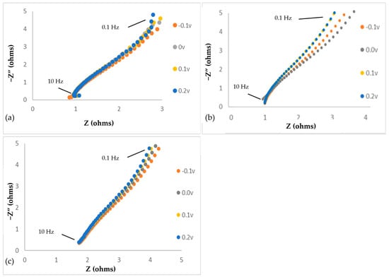 EIS Nyquist plots of CO-A1 sensor response to alcohol-saturated air at different steady-state voltages (−0.1 to 0.2 V) within a set frequency range (0.1 < f < 10 Hz). (a) Methanol; (b) ethanol; (c) heptan-1-ol.