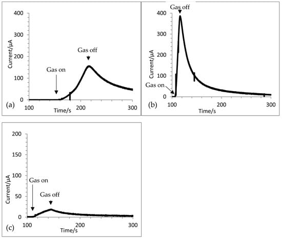 Chronoamperometric responses of CO-A1 sensor to pulse of each alcohol saturated in air at 0.0 V dc (single pulse, flow rate: 50 mL min−1). (a) Methanol; (b) ethanol; (c) heptan-1-ol.