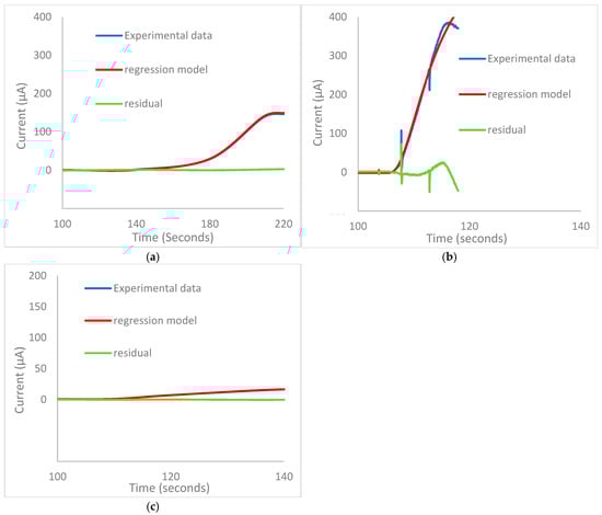 Model fitting of sensor response to gas at 0.0 V dc and 20 °C. Experimental data (blue); regression model (red); and residual (green). (a) Methanol; (b) ethanol; (c) heptan-1-ol.