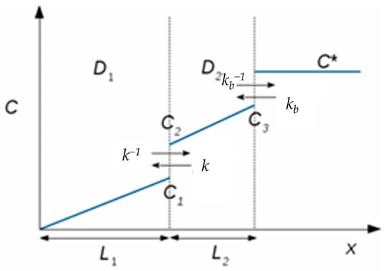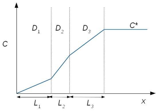 The analyte is assumed to be in the gas phase during stages (i) and (ii), whilst the analyte is taken to be in the liquid phase during stage (iii). It is assumed that any reaction at the electrode surface is not affected by electrode kinetics (such as electron transfer) at the potential used during chronoamperometry; this is because the electron transfer kinetics are so fast compared to the mass transport through the sensor that they are considered functionally negligible in terms of the calculations and sensor behaviour. The potential remains fixed throughout the chronoamperometry experiments. Note that this means the Butler–Volmer equation can be functionally ignored. This is explained further in previous work [62]. Partition equilibria between the different phases are ignored for the sake of simplicity. Firstly, the response of the sensor under a steady-state current is considered. When the model is assumed to be simple and to have no kinetic barriers for the analyte (or at least so small relative to the other diffusion coefficients so as to be negligible) during the changes in phase within the sensor, a graph of concentration (C) can be plotted against the distance (x) from the working electrode and takes the form of a series of straight lines as the diffusion coefficient changes due to being in different phase media (Figure 9). Where the maximum initial concentration (C*) is outside of the sensor, the diffusion coefficient (D) and layer thickness (L) are numbered sequentially according to the distance from the working electrode.