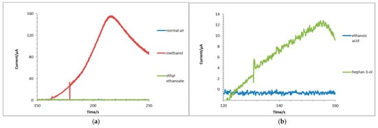 In order to investigate the selectivity of the sensor’s response to the hydroxyl functional group, the sensor was exposed to ethyl ethanoate and ethanoic acid vapours. These compounds were chosen due to being the simplest molecules with functional groups analogous to primary alcohols and containing the -OH hydroxyl moiety. The sensor was exposed to ethyl ethanoate and then methanol-saturated air (Figure 11a). Similarly, the sensor was exposed to pulsed ethanoic acid-saturated air and then pulsed heptan-1-ol-saturated air (Figure 11b). Each analyte had a 50 mL min−1 flow rate. The sensor displays selectivity towards different functional groups in so far as it does not give a measurable amperometric response to the compounds with ester and carboxylic acid functional groups. This is most likely because the sensor is at room temperature, and so there is not enough thermal energy to overcome the steric hindrance and inductive effects within the carboxylic acid and ester functional groups. It is also possible that the voltage range used within the experiments is insufficient to overcome these effects. The fact that the sensor can give an amperometric response to the primary alcohols even after being exposed to the other functional group compounds suggests that the compounds did not react with the Pt nanoparticle electrode to form a passivation layer. It is more likely that the compounds are dissolved within the sulfuric acid electrolyte and so do not interfere with the working of the sensor. This means that the sensor is usable in environments even where the exact type of VOC functional group is not known or if there is a mixture of VOCs present in the atmospheric environment (even though it cannot differentiate between different primary alcohols).