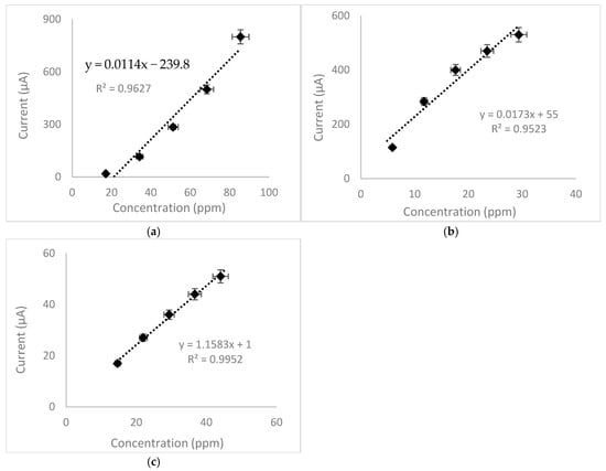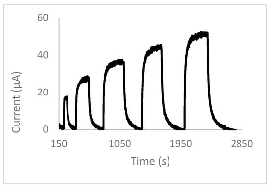 The sensor can provide quantitative data via amperometric data. Thus, known concentrations of the primary alcohols as an aerosol in dry air (zero air) were passed over the sensor. The data for heptan-1-ol are shown for clarity (Figure 12). The data show good repeatability and reproducibility due to the signal current going back to zero after each analyte pulse. For the calibration curves, the amperometric current response increases with the increasing analyte concentration (Figure 13), and the sensor is capable of detecting ppm levels of primary alcohols. The sensor has a sensitivity of approximately 2.2 µA/ppm to primary alcohol-saturated air (the largest graph gradient plus signal noise). The signal noise for the sensor has a current of 1 µA. Whilst the sensor has a theoretical limit of detection (LoD) of 1.86 (±0.02) ppm (the concentration required for the current to be 3× above signal noise), the calculated LoD for each alcohol was methanol 17 (±1) ppm, ethanol 2 (±1) ppm, and heptan-1-ol 3 (±1) ppm.