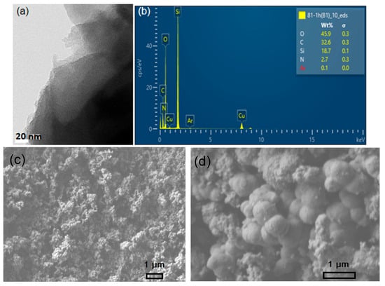 The morphological features observed in the bare particles (Figure 1a,c,d) are consistent with those previously reported for NC/SiOC [32], where spherical-like particles are obtained. A TEM-EDS analysis (Figure 1b) revealed peaks corresponding to oxygen (Kα = 0.533 keV), silicon (Kα = 1.84 keV), carbon (Kα = 0.282 keV), nitrogen (Kα = 0.392 keV), and Cu (Lα = 0.851 keV), the latter originating from the Lacey grid used as a substrate for sample deposition.