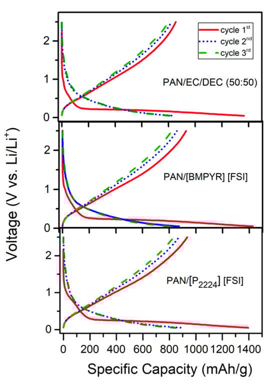 Charge/discharge voltage profiles for the first three cycles at a current density of 0.1 A/g for NC/SiOC-PAN composite electrodes with a mass loading of 1.4–1.6 mg with different electrolytes. (Top) commercial organic solvent EC/DEC with 1 molL−1 LiPF6; (middle): [BMPYR][FSI]; and (Bottom): [P2224][FSI]. For both ionic liquid-based electrolytes, 1 molL−1 LiFSI was used as the lithium salt.