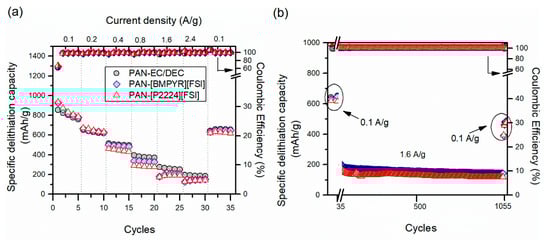 CR2032 (MTI corporation, Richmond, CA, USA) coin cells were assembled in an argon-filled glovebox using a Celgard 2320 and microfiber disk (Whatman GF/F) as separators for EC/DEC and ILs, respectively. Electrolytes were composed as shown in Table 1. Electrochemical measurements of half-cells were normalized based on the mass of the SiOC active material. The rate capabilities of the composite electrodes were evaluated at various current densities ranging from 0.1 to 2.4 A/g. Coulombic efficiency was also calculated with ((Cdealloy)/(Calloy)) × 100, where Calloy and Cdealloy represent the lithiation and delithiation capacities of the negative electrode, respectively.
