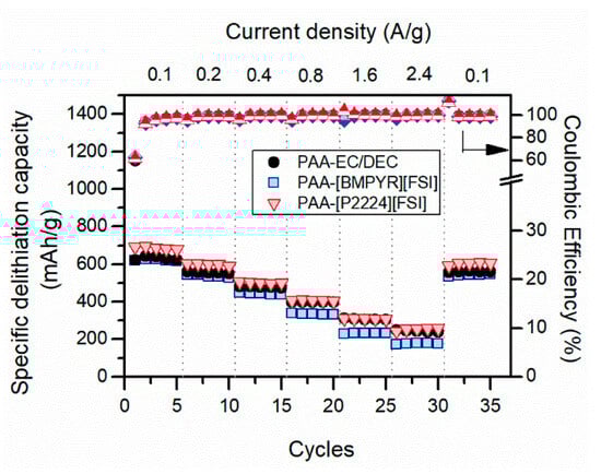 Delithiation capacities over 35 cycles at current densities ranging from 0.1 to 2.4 A/g, along with Coulombic efficiency, are shown in Figure 5. The three electrolytes exhibit similar delithiation behavior, with a slight difference observed at the beginning as both PAA-[BMPYR][FSI] and EC/DEC deliver capacities around 620–630 mAh/g, while PAA-[P2224][FSI] shows a slightly higher capacity of approximately 690 mAh/g. At higher current densities (0.4–2.4 A/g), the performance trends differ. PAA-[BMPYR][FSI] exhibits significantly lower capacities, while PAA-[P2224][FSI] and EC/DEC maintain relatively similar values. As the current increases, the time available for lithium-ion insertion/extraction is reduced. Under these conditions, IL-based electrolytes suffer from higher viscosity and slower ion mobility compared to EC/DEC, leading to more pronounced capacity fading, as has been previously reported [9]. However, the similar electrochemical performance observed for PAA-[P2224][FSI] and EC/DEC has also been reported in silicon-based electrodes, where [P2224][FSI] appears to compensate for its high viscosity by contributing to the stabilization of the SEI [9].