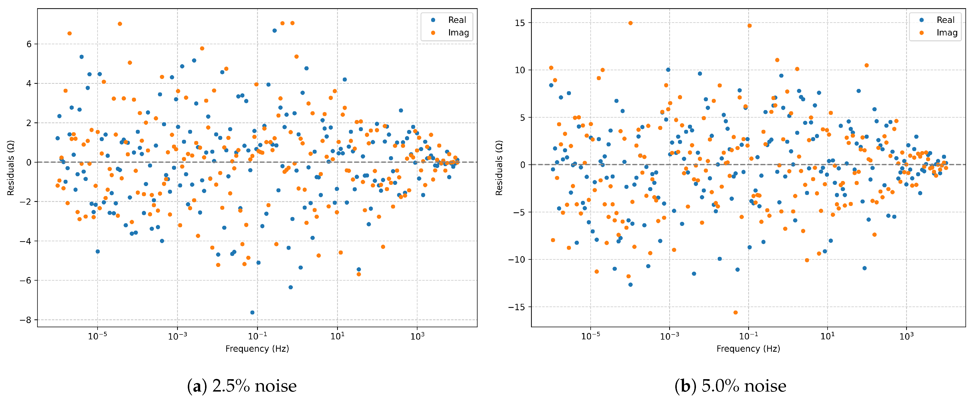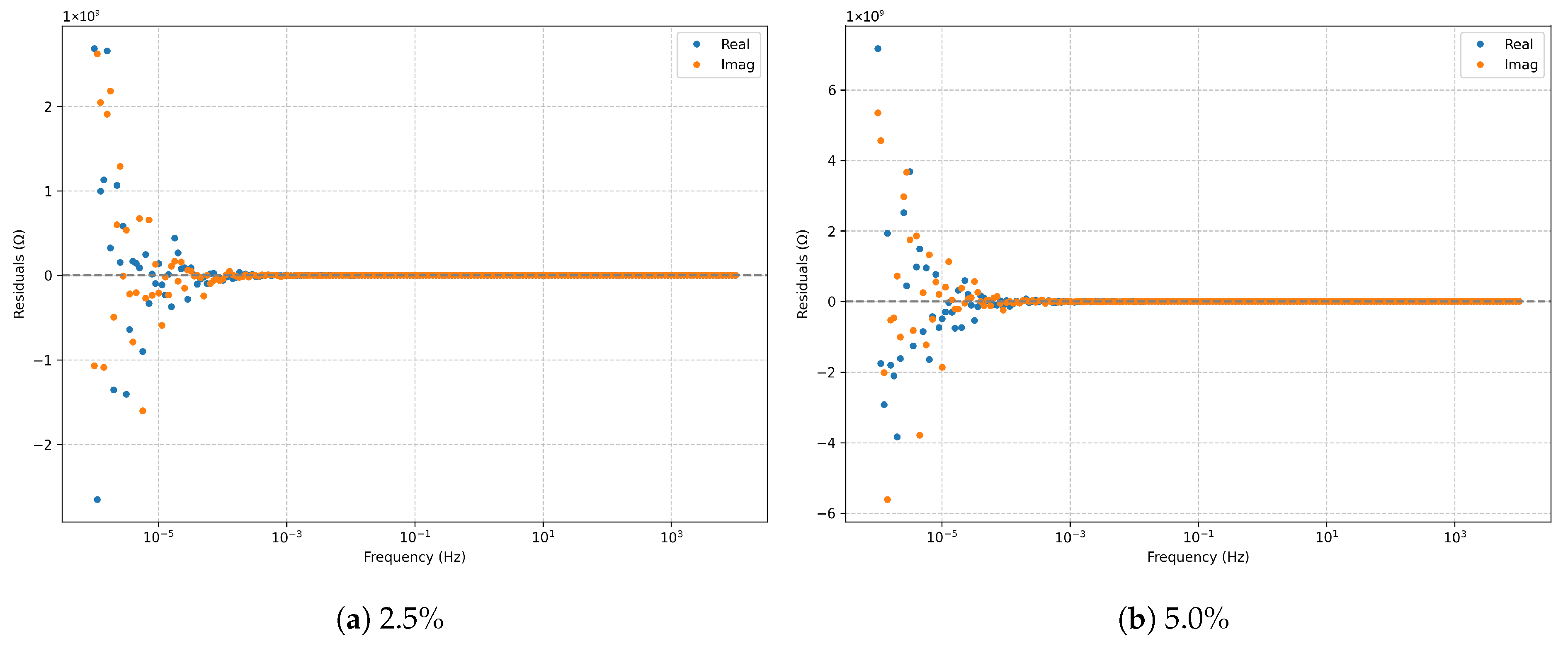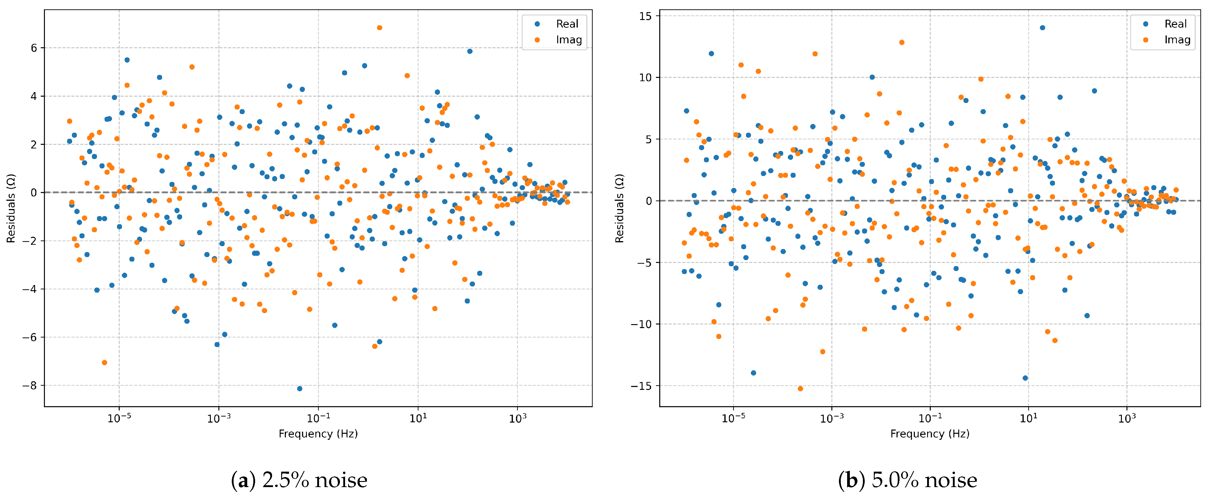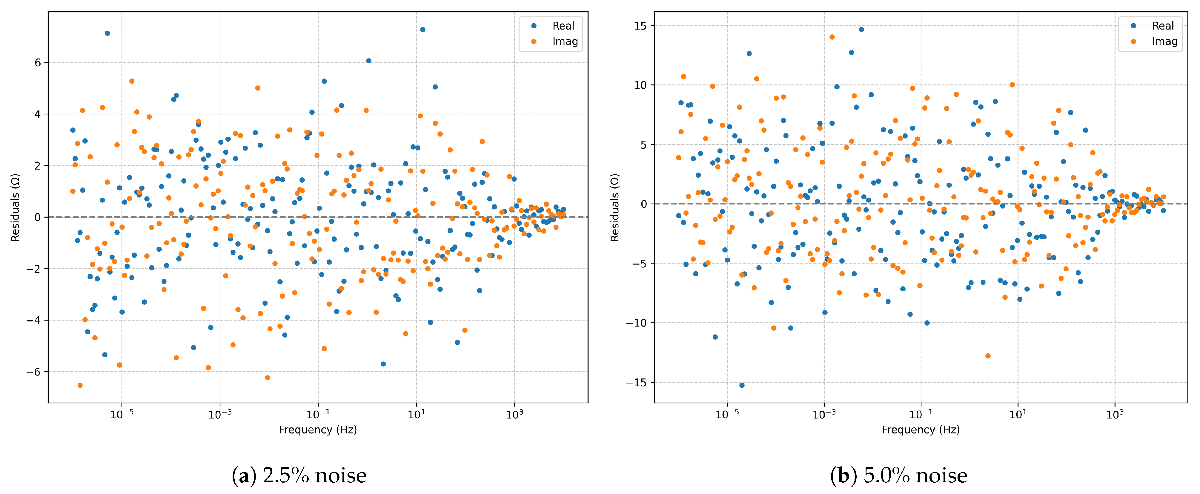 Raw complex residuals (real and imaginary parts) for the series RLC model: (a) 2.5% noise; (b) 5.0% noise.