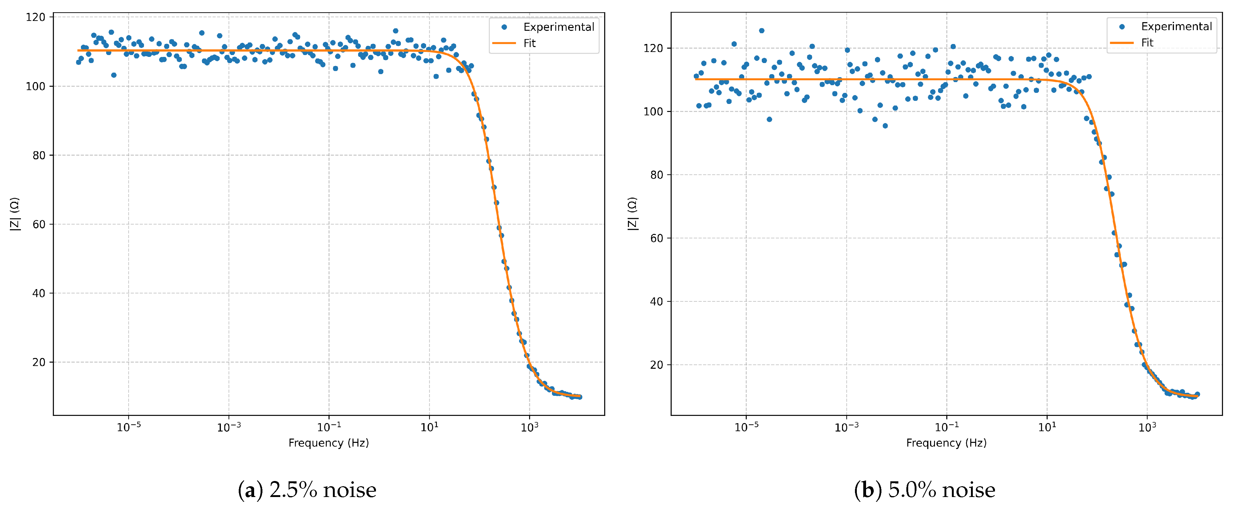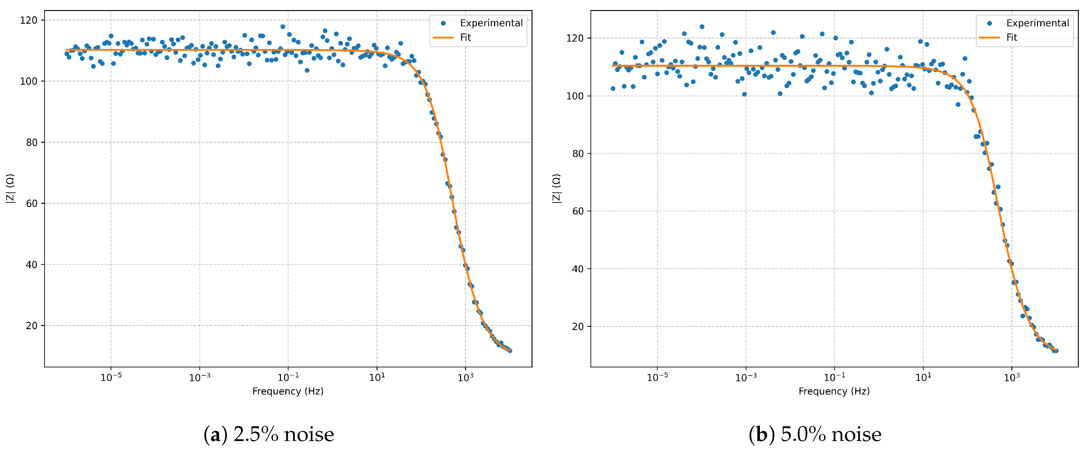 Bode magnitude for the Randles+CPE model: (a) 2.5% noise; (b) 5.0% noise.