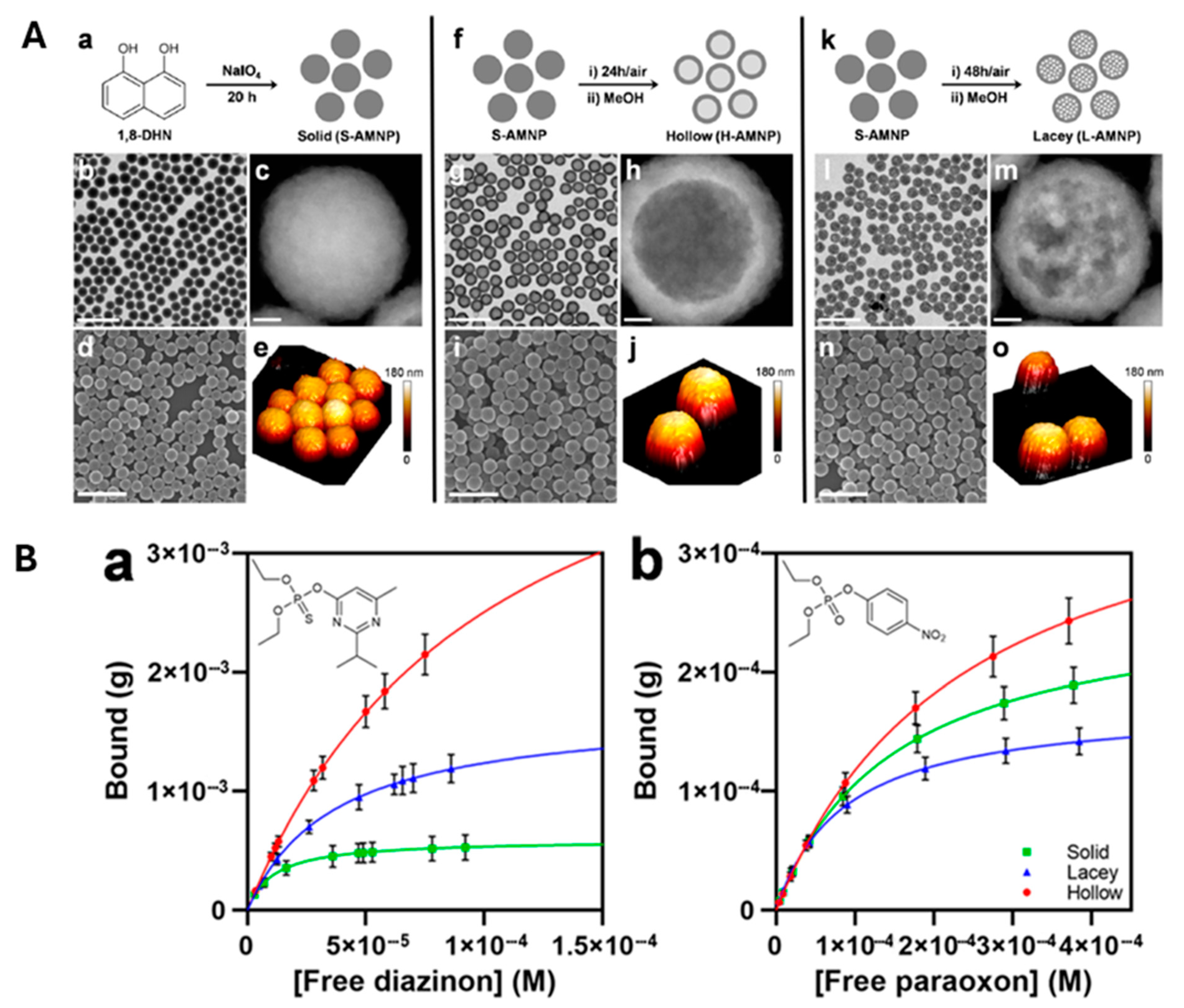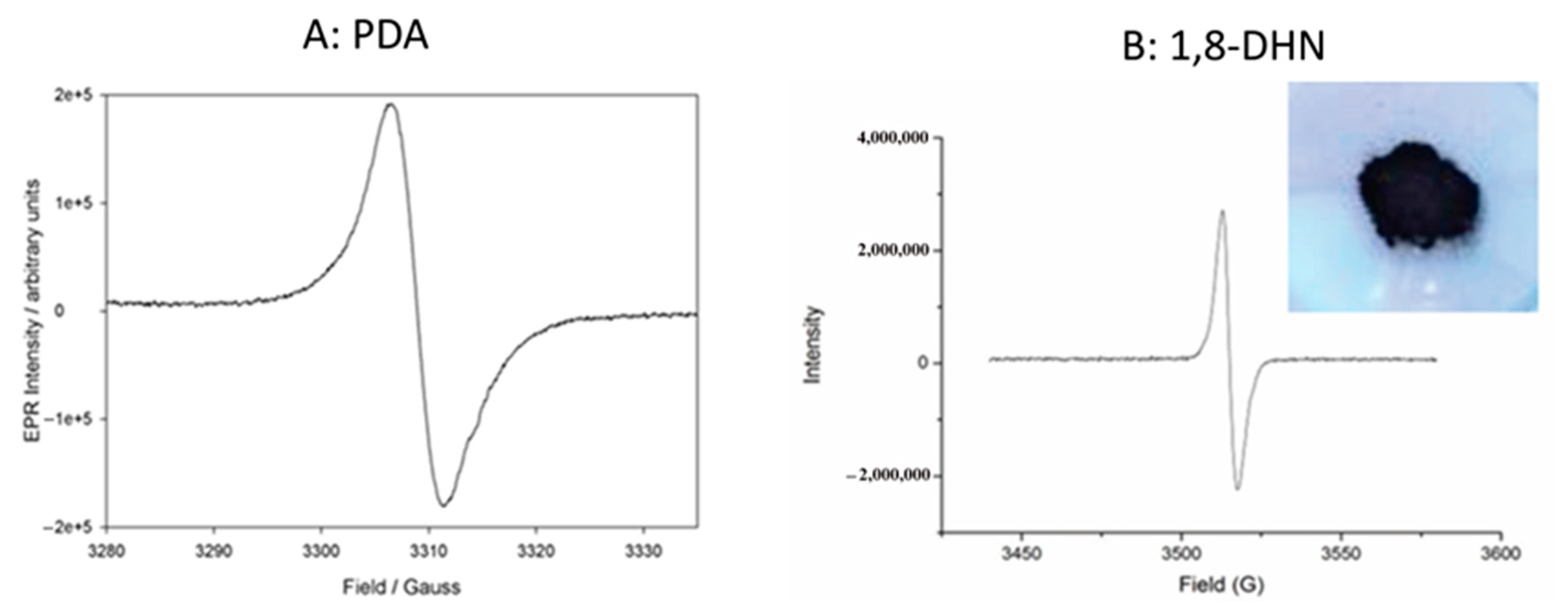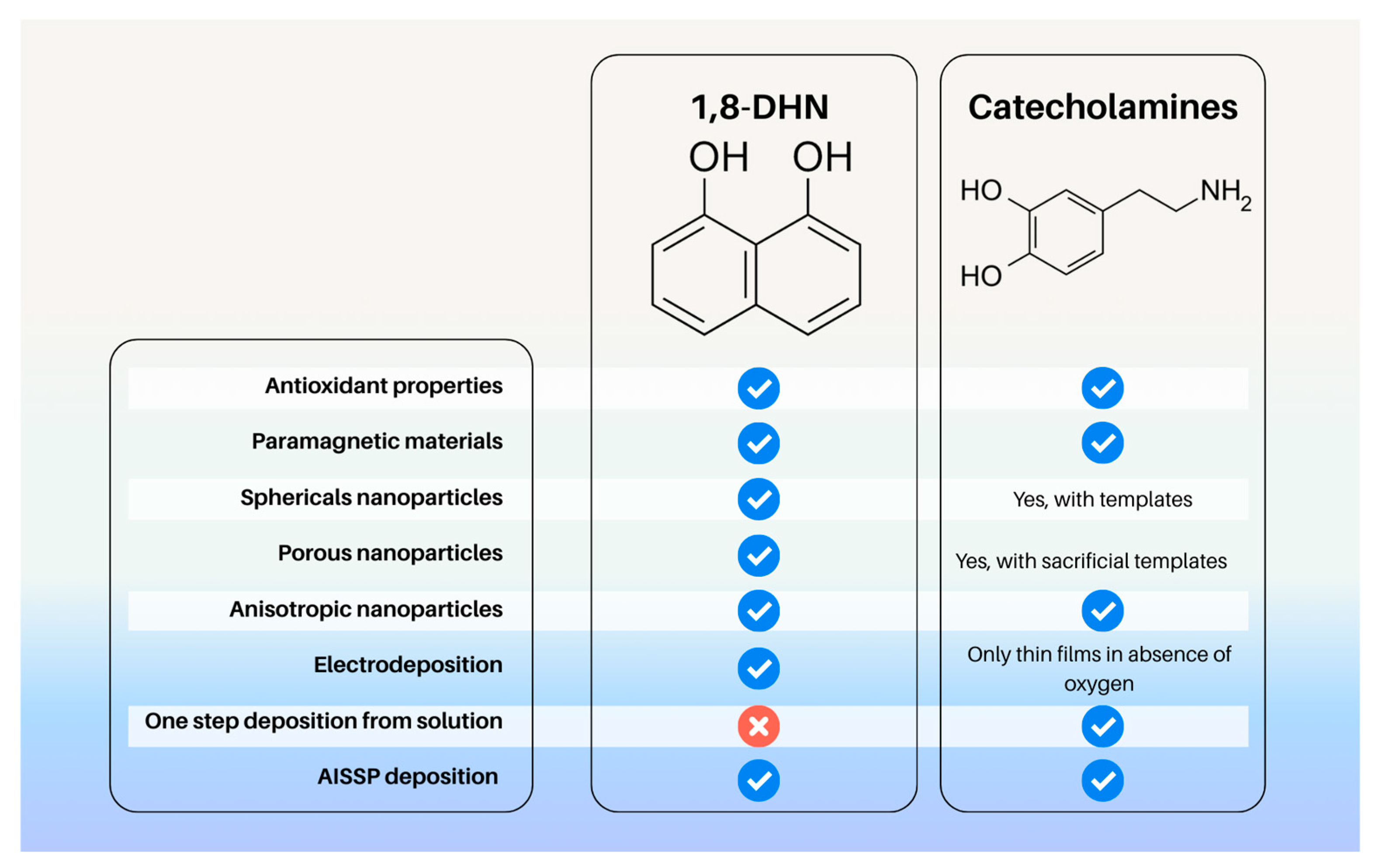 - Concerning the synthesis of nanomaterials, DHNs seem to offer a much greater versatility than catecholamines. Except at very low precursor concentrations, the solution oxidation of catecholamines (and of catechols) induces precipitates. To obtain nanomaterials from catecholamines and catechols, templating agents such as proteins or boric acid, must be added at sufficiently high molar ratios. In contrast, the oxidation of 1,8-DHN leads to nanoparticles in a one-step process [44]. In addition, the porosity of the 1,8-DHN nanoparticles can be easily tailored post-synthetically by solvent treatment with methanol. On the other hand, obtaining porous capsules from PDA is much more complex for it requires PDA deposition on a sacrificial template followed by dissolution of the core with an appropriate solvent [45,46].