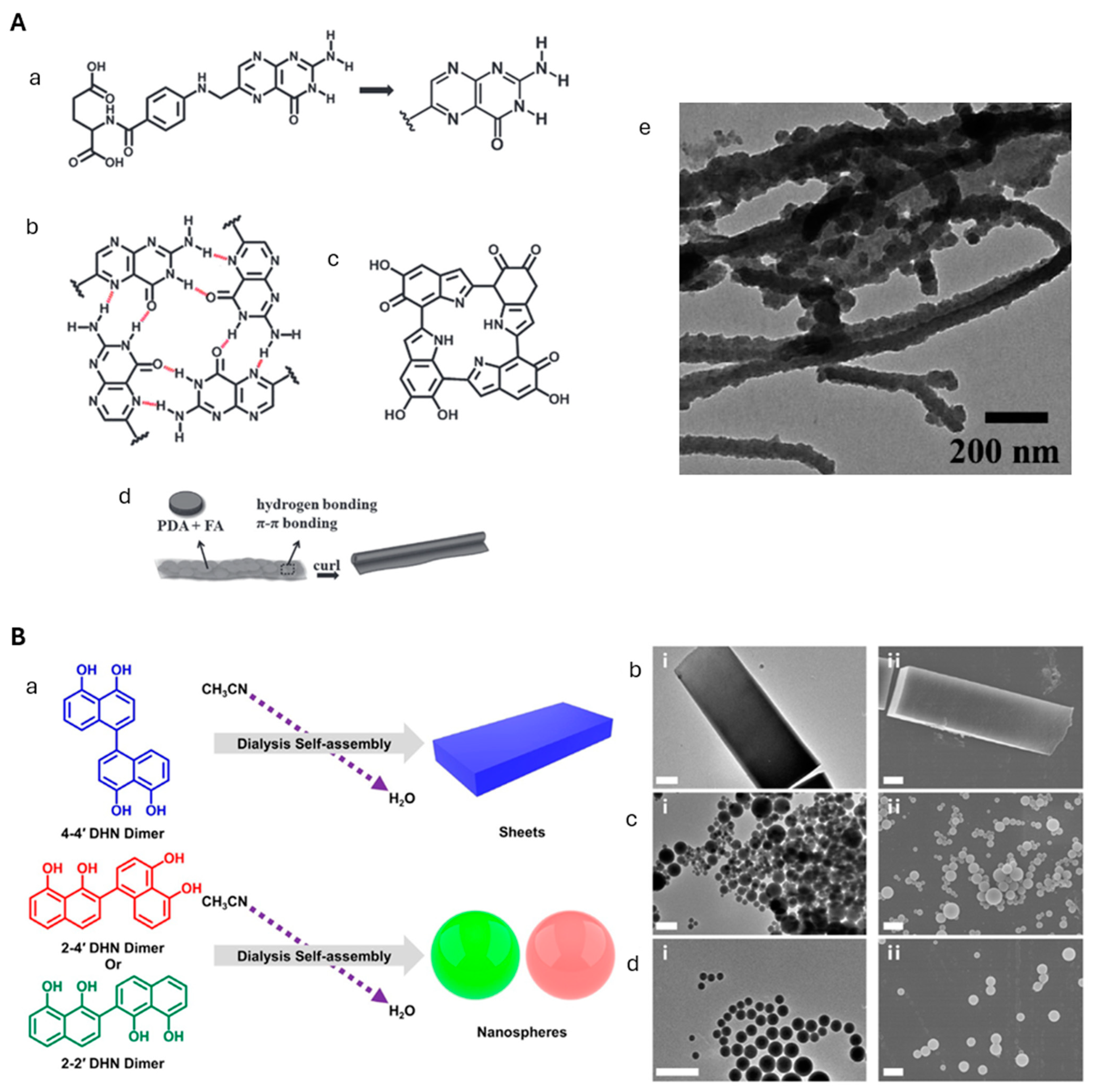| Anisotropic nanomaterials | PDA nanofibers in the presence of folic acid [42,43]. | 5 to 10 µm length platelets from the 4,4′-DHN dimer [38]. |
