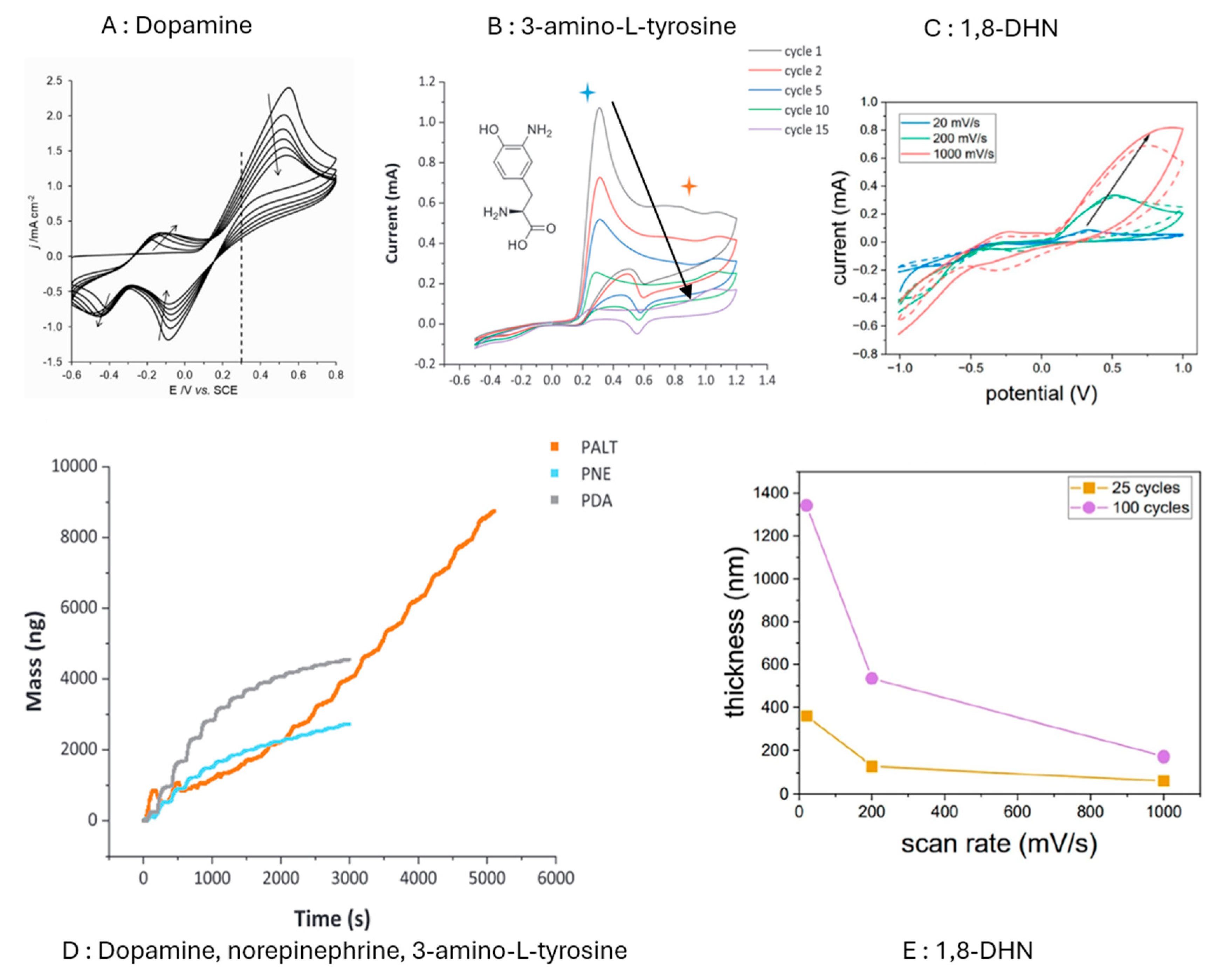 - Regarding film electrodeposition, which requires a conductive substrate, extensive data exists for catecholamines and catechols. Among DHN isomers, to our knowledge, only 1,8-DHN [88] and 2,6-DHN [95] have been investigated. For 1,8-DHN, it was shown that the intrinsic limitation of catecholamine–catechol-based films, namely fast passivation of the electrode by thin films, can be easily overcome in a potential sweep rate dependent manner. Indeed, at potential sweep rates as low as 20 mV.s−1 films of up to 1.3 µm in thickness can be obtained in a one-pot process after 100 CV cycles on gold working electrodes. Lower potential sweep rates should be investigated in the future with the possibility to get even thicker films but at the cost of longer electrodeposition time.