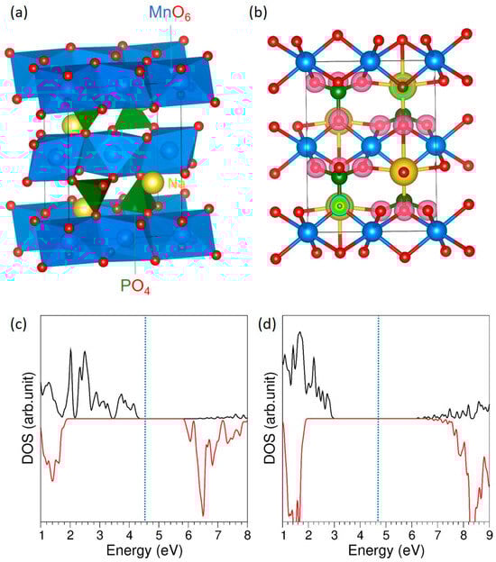Figure 1b presents the charge density distribution, where strong electron accumulation is observed around the oxygen atoms, confirming their highly electronegative character and indicating predominantly ionic bonding between Na–O and P–O, with some degree of covalent interaction in Mn–O bonds. This is further supported by the Bader charge analysis, which reveals effective charges of +1.00 on Na, +1.62 on Mn, +5.00 on P, and 1.90 on O, consistent with the expected oxidation states and confirming the strong charge localization on oxygen. The incorporation of the Hubbard U parameter significantly altered the electronic structure by widening the band gap from 1.40 eV to 3.20 eV (see Figure 1c,d). This increase arises from the enhanced localization of the Mn 3d states, which reduces their hybridisation with the surrounding orbitals and effectively pushes the conduction and valence band edges further apart. Such behavior is consistent with previous DFT + U studies [36], highlighting the critical role of on-site Coulomb interactions in accurately describing the electronic properties of Mn-containing systems. Its magnetic character is evidenced by the asymmetry of the DOS plot with respect to the x-axis, as also reported in earlier work [36].