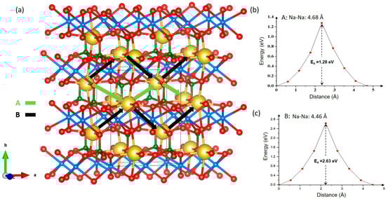 (a) Na-ion migration hopping and activation energies of (b) hop A and (c) hop B.