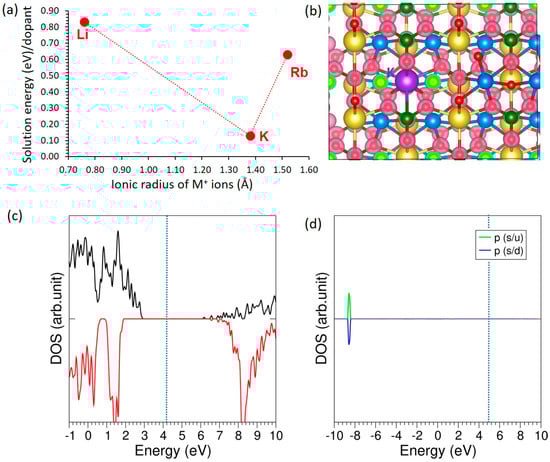 Figure 3 summarizes the effect of monovalent substitution at the Na site. In Figure 3a, the solution energies of Li, K, and Rb are plotted against their ionic radii, revealing a clear minimum for K. This lowest solution energy indicates that K incorporates most readily into the lattice, whereas Li (undersized) and Rb (oversized) exhibit higher energies, consistent with size mismatch and the associated elastic/structural penalty. While our default dopant reservoirs are the corresponding oxides (Li2O, K2O, Rb2O), realistic conditions are captured by enforcing host-stability inequalities and considering competing dopant-bearing phases (e.g., alkali phosphates/halides/peroxides) and Na-rich/Na-poor limits; these choices may shift absolute values but do not alter the qualitative conclusion that K incorporates most readily. Figure 3b shows the charge density plot for the K-doped system, where the redistribution of electronic density around the dopant and neighboring atoms is clearly visible. Figure 3c shows the total DOS, confirming that K-doping does not introduce states at the Fermi level and preserves the insulating nature of the host material. Figure 3d illustrates the atomic DOS of K, where the p-states of K are localized deep in the valence region, far from the Fermi level, further confirming its limited electronic activity.