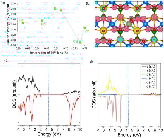 Transition metal dopants display distinct structural and electronic features compared to alkali and alkaline earth substitutions. In general, their smaller ionic radii (0.61–0.74 Å) yield shorter M–O bond lengths (2.05–2.21 Å) than those observed for larger alkali or alkaline earth cations. Among them, Ni (0.69 Å) forms the shortest bond (2.05 Å), consistent with stronger hybridization with oxygen, while Zn (0.74 Å) produces the longest bond (2.21 Å). The Bader charge transfer varies significantly across the series, from +0.98 |e| in Cu to +1.52 |e| in Fe, reflecting differences in d-electron configurations and bonding characteristics (see Table 6). All transition metal dopants reduce the magnetic moment slightly compared to the undoped system, with values ranging from 4.63 µB (Cu) to 4.94 µB (Fe), indicating partial quenching of magnetization due to d-state participation. Unlike alkali and alkaline earth elements, transition metal substitution consistently leads to lattice contraction, with ΔV/V values between −0.18% and −0.38%, highlighting the stronger electronic interactions between the transition metal d-orbitals and the oxygen sublattice.