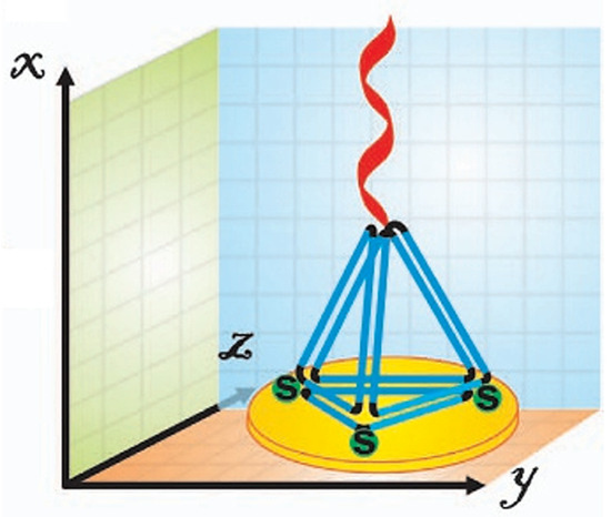 Schematic illustration of tetrahedral DNA nanostructure (TDN) functionalization in a biosensor. Three vertices are modified with thiol groups (green) for surface anchoring, while the upward-facing vertex carries capture DNA (red) for target recognition. Reproduced from [28] under the terms of the Creative Commons Attribution-Non-Commercial License (CC BY-NC).