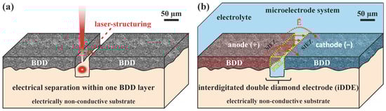 The idea of an all-diamond electrode is well described in the literature for the purpose of electrochemical sensing with either a microelectrode array [,,,] or needle-shaped electrode [,]. In general, an undoped diamond (UDD) layer insulates the conducting BDD. In most cases, a combination of multiple processing steps, such as the CVD of BDD and UDD, lithographic techniques, precise laser-structuring, or ion beam cutting, is needed to manufacture all-diamond electrode systems. In the case of the electrode design for this study, a BDD layer with a thickness of 6–8 µm is deposited on a non-conductive ceramic-based substrate. A selective removal of well-defined regions splits the electrically conductive diamond layer into two or multiple electrically separated areas, as shown in Figure 1a.