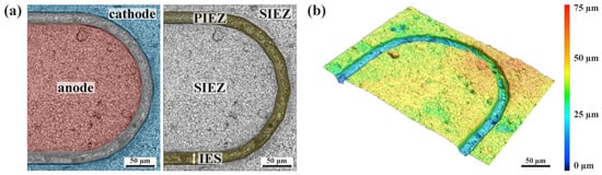 A tip of the “finger-like” network structure used to fabricate the iDDE is shown in Figure 2. The LSM images illustrate the working principle of the iDDE concept. The laser-structured trench between cathode and anode is in the range of 20–50 µm for samples in this study. The trench and, therefore, the IES between cathode and anode is 20–25 µm wide in the case of Figure 2 and has an average depth of 30 µm. The laser does not just ablate the diamond layer (7 ± 0.5 µm) but also penetrates deep into the ceramic substrate. The space that is directly defined by the width and length of the laser-cut gap is the PIEZ, as the minimal interelectrode distance is solely determined by the resolution of the chosen structuring system. The reaction space above the nominal surfaces of the anode and cathode, on the other hand, represents the SIEZ. Fundamentally, the zones differ due to distinct distances between the cathode and the anode; while the IES should be constant in the case of the PIEZ, it is larger and variable in the case of the SIEZ, depending on the reaction site considered.