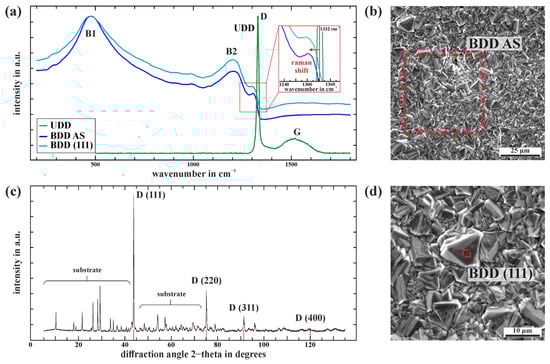 Raman spectra of an area scan (BDD AS) of the grown BDD layer of an iDDE and an averaged scan of a (111) facet are also shown in Figure 3a. Both spectra exhibit similar trends with a characteristic diamond peak at around 1306 cm−1 and less resolved peaks for boron at around 480 cm−1 (B1) and 1200 cm−1 (B2). The BDD Raman data refer to the microcrystalline diamond shown in Figure 3b within the SIEZ of Figure 2a. The polycrystalline BDD layer predominantly exhibits a (111) morphology with pronounced twinning while crystal facets reach up to 5 µm in size. The diamond diffractions in the XRD spectra correspond to (111), (220), (311), and (400) planes, while (111) has the highest intensity of all (comp. Figure 3c). The unspecified XRD peaks originate from the cordieritic substrate. The SEM images (Figure 3b,d) confirm the predominance of the (111) morphology in combination with (110). Surfaces with (111) orientation are known to be more electrochemically active compared to (100) faces due to higher boron incorporation during the CVD process and, therefore, exhibit higher electrical conductivity [,,,]. The minor deviations in the Raman signal of a single (111) facet (comp. Figure 3d) compared to the large area scan (BDD AS) support a significant incorporation of boron within the grown BDD layer.