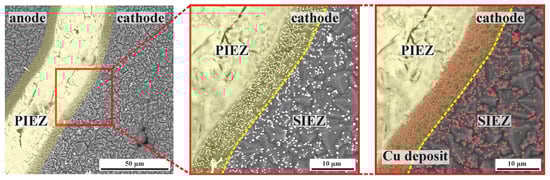 SEM images of a cathodic Cu deposition at an iDDE via the detection of backscattered electrons. The PIEZ is artificially colored yellow. A dotted yellow line separates the PIEZ and the SIEZ. The deposited copper is artificially colored red on the right-hand side.