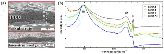 (a) Cross-sectional SEM image of the laser-structured BDD layer within the PIEZ of an iDDE. (b) Raman spectra within the PIEZ according to (a) and an area scan (BDD AS) of the BDD surface within the SIEZ (compare Figure 3a).