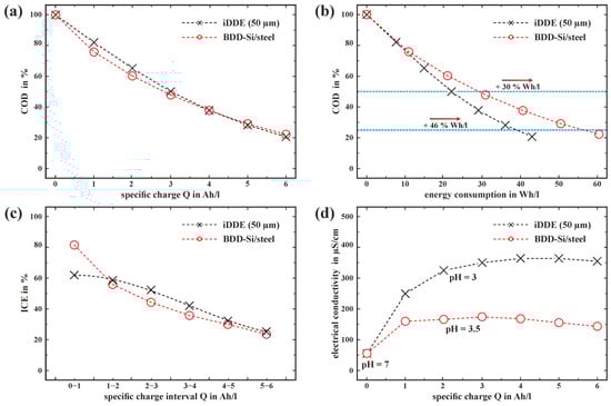 It should be noted that for the BDD-Si/steel configuration, the maximal measured ICE of 87% is significantly higher compared to the iDDE with an ICE of 62%, which can be explained by the different flow dynamics of each setup. An iDDE with a longer laser structure could counteract mass transport limitations due to the increase in the electrochemically active surface area within the PIEZ. Reducing the IES in the case of the BDD-Si/steel, on the other hand, would decrease the required voltage and thus reduce energy consumption for a given amount of charge. At the same time, the altered fluid dynamics may lead to poorer ICE due to mass transport limitations. The measurement of different electrolyte conductivities (κ) evolving during the EAOPs (comp. Figure 6d) is noticeable. While the conductivity in the case of BDD-Si/steel electrode setup increases to an average of up to 163 ± 6 µS/cm from the initial 55 ± 2 µS/cm, the conductivity of the electrolyte in the case of the iDDE reaches 320 ± 11 µS/cm after 1 Ah/L, leading to lower required voltage and, therefore, lower energy consumption. The main reason for the difference in energy efficiency is, therefore, attributed to varying electrolyte conductivities throughout the electrolysis experiment. Running the iDDE in the same electrolyte as the BDD-Si/steel configuration after finishing the degradation experiment (κ = ~163 µS/cm, Q = 6 Ah/L) suggests still 14% more energy efficiency in the case of the iDDE due to a lower required voltage for the same current. Degradation experiments within ultra-pure water (κ = 0.05 µS/cm) support this observation (compare S5).